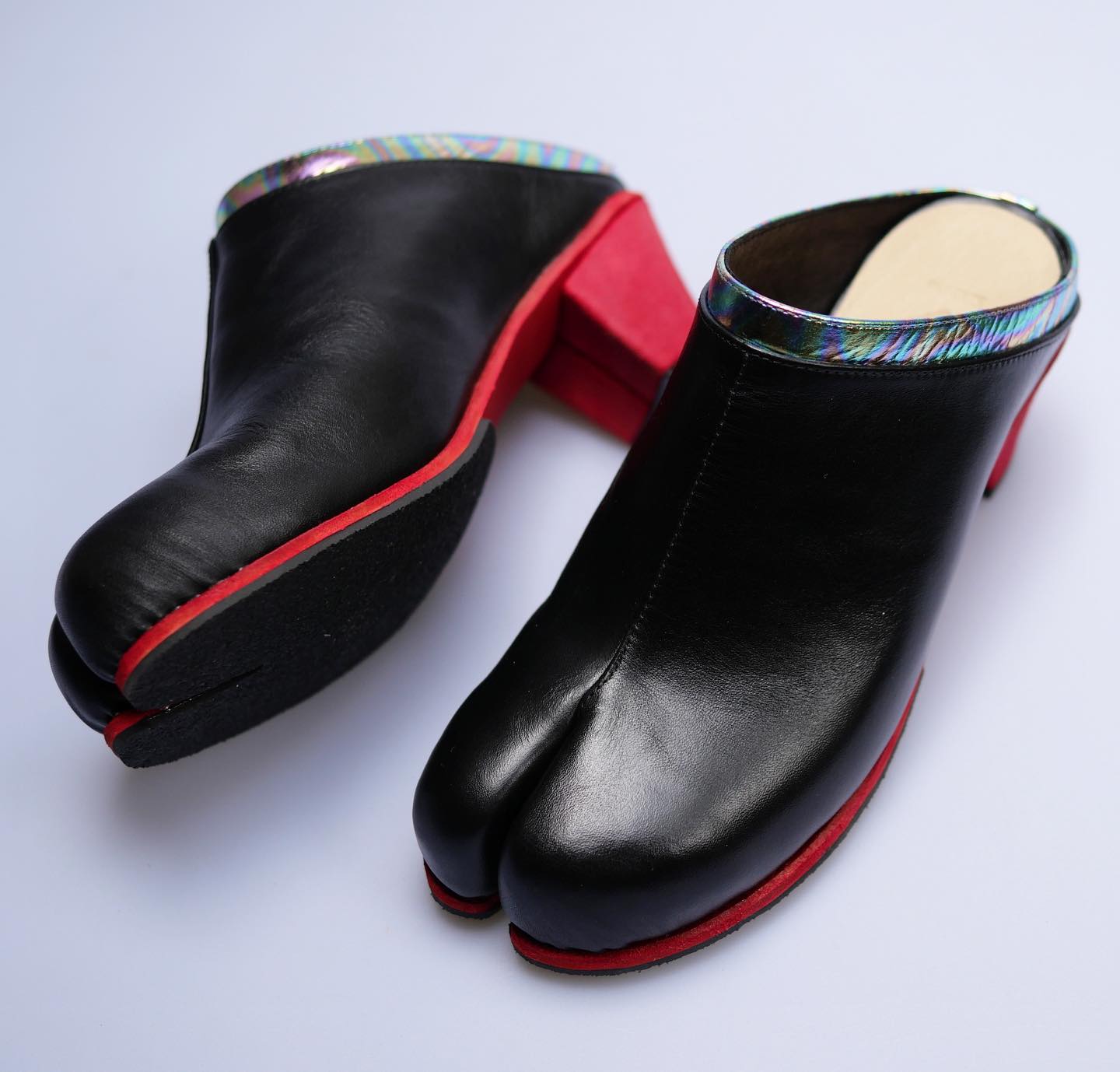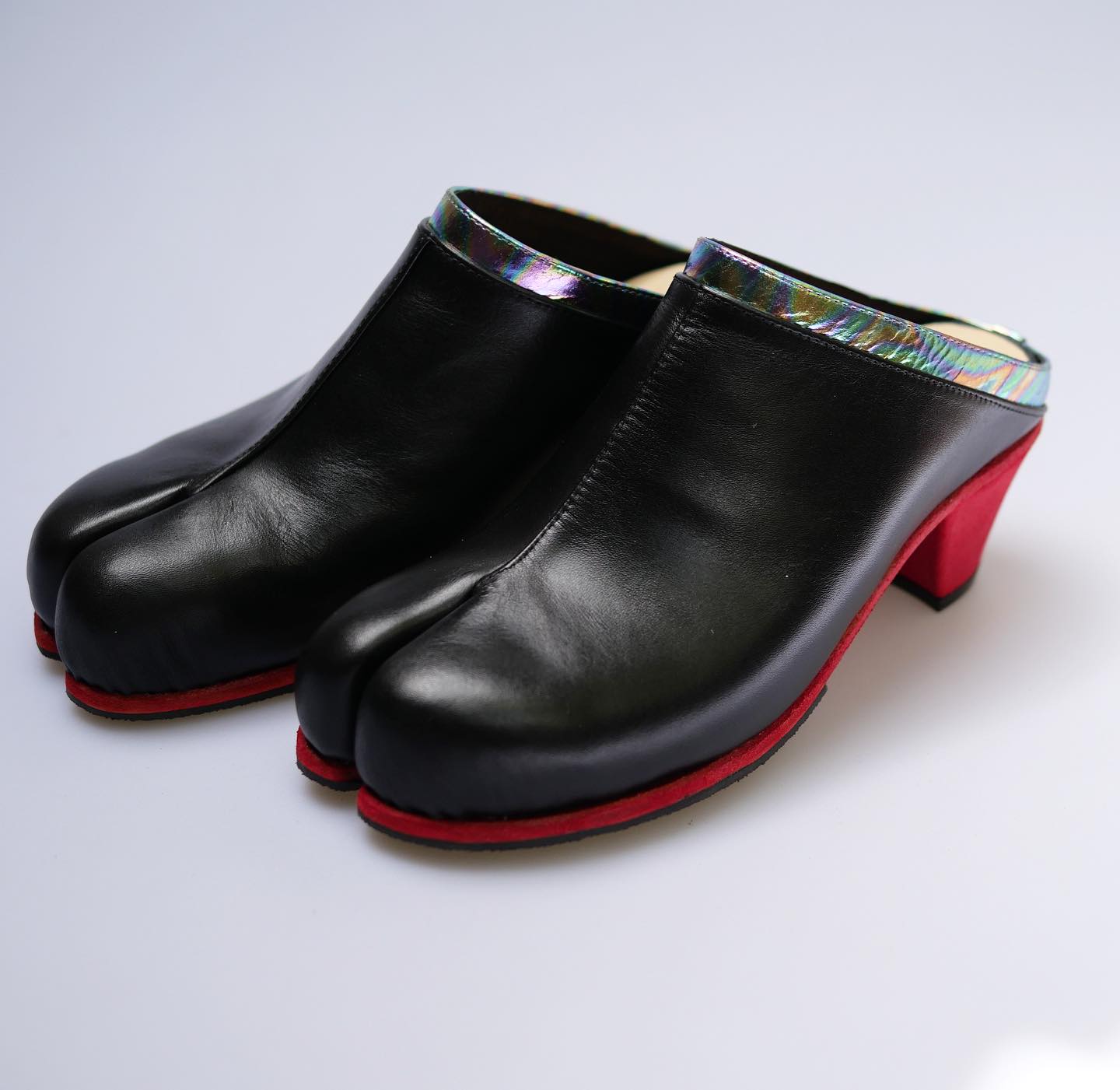 寸五踵単皮 履き口玉虫文様箔仕様 ミッドソール、ヒール緋色染め