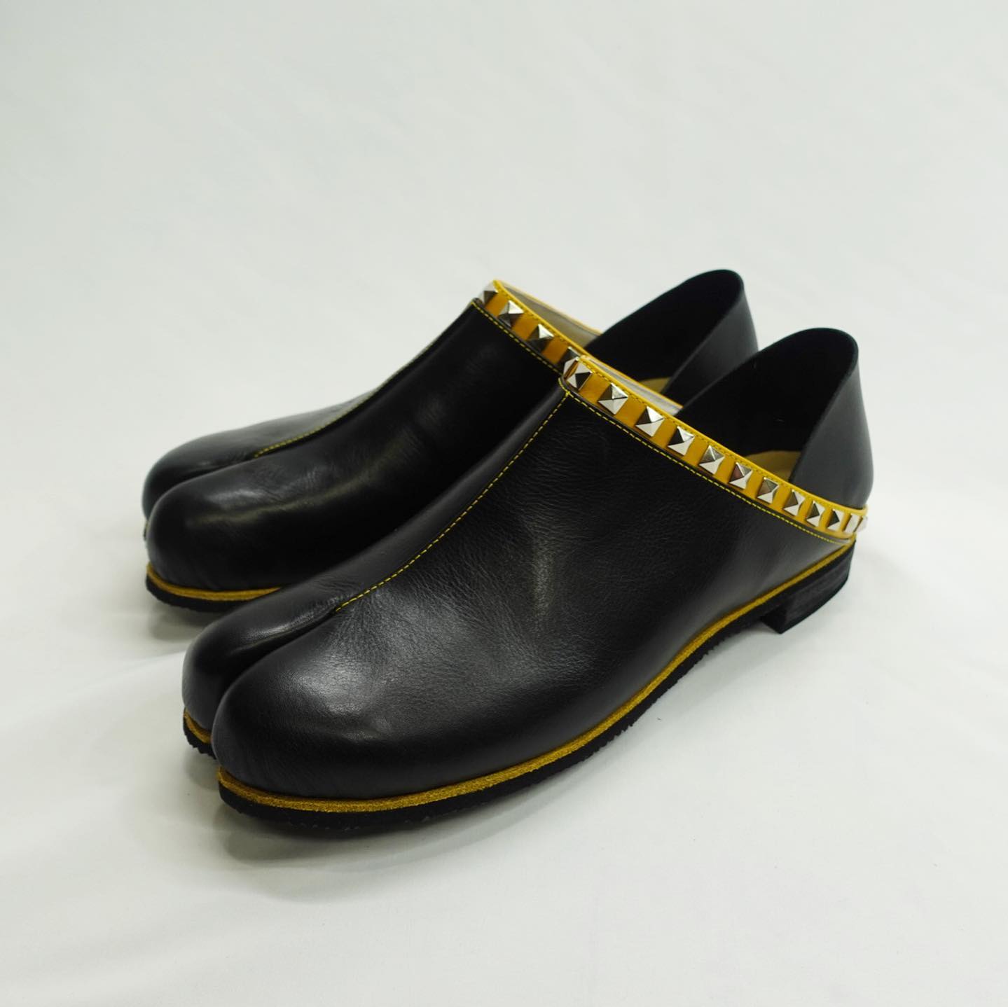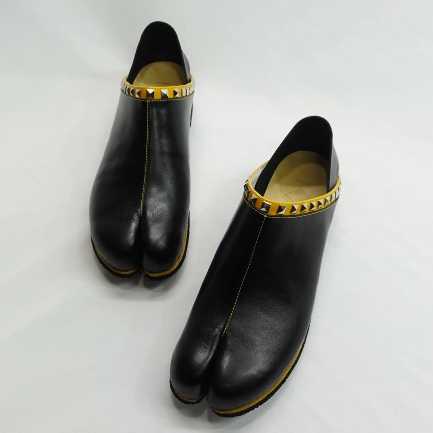 踵単皮スタッズ仕様特注履き口+ステッチ+ミッドソール山吹色