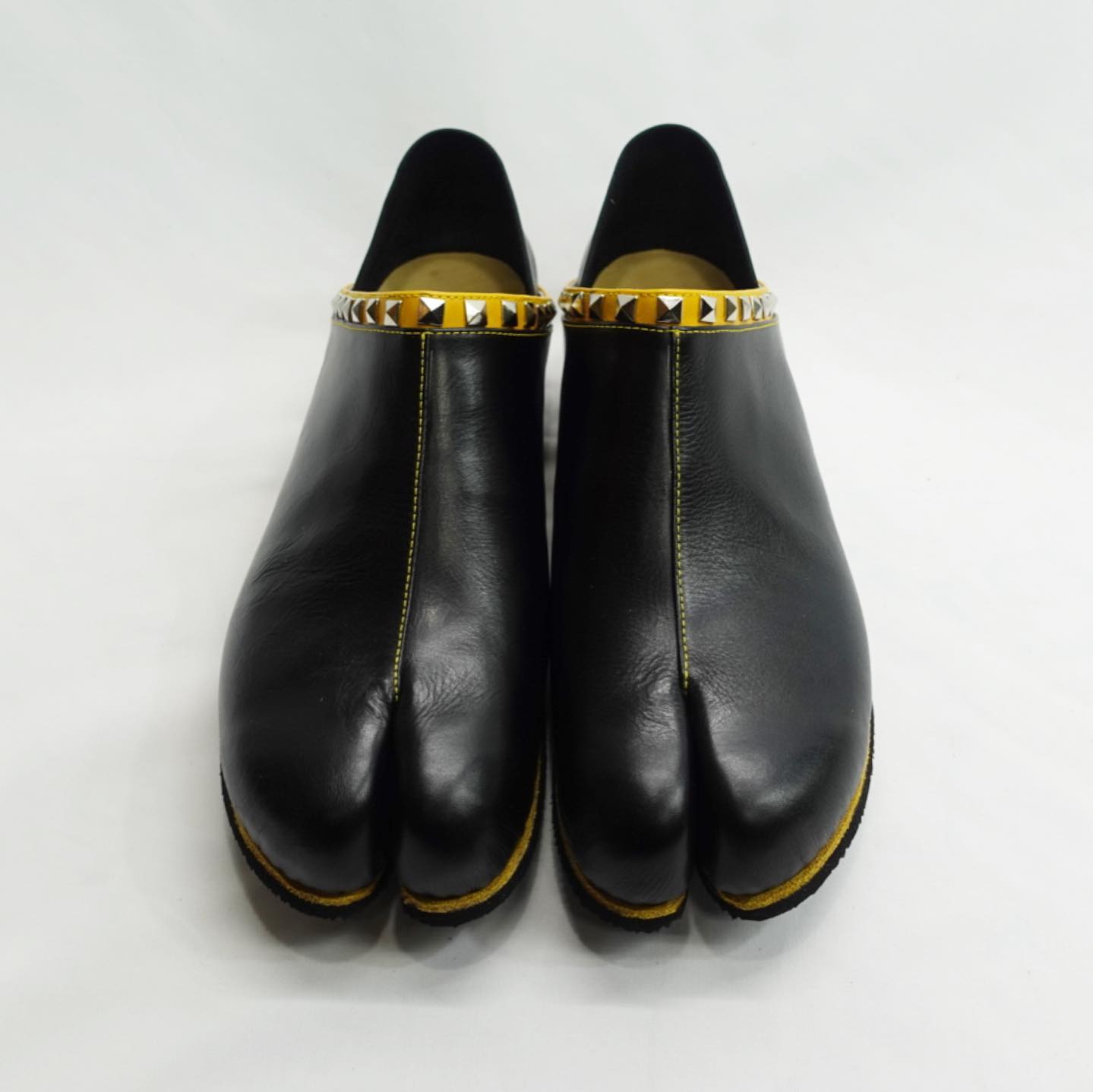 踵単皮スタッズ仕様特注履き口+ステッチ+ミッドソール山吹色