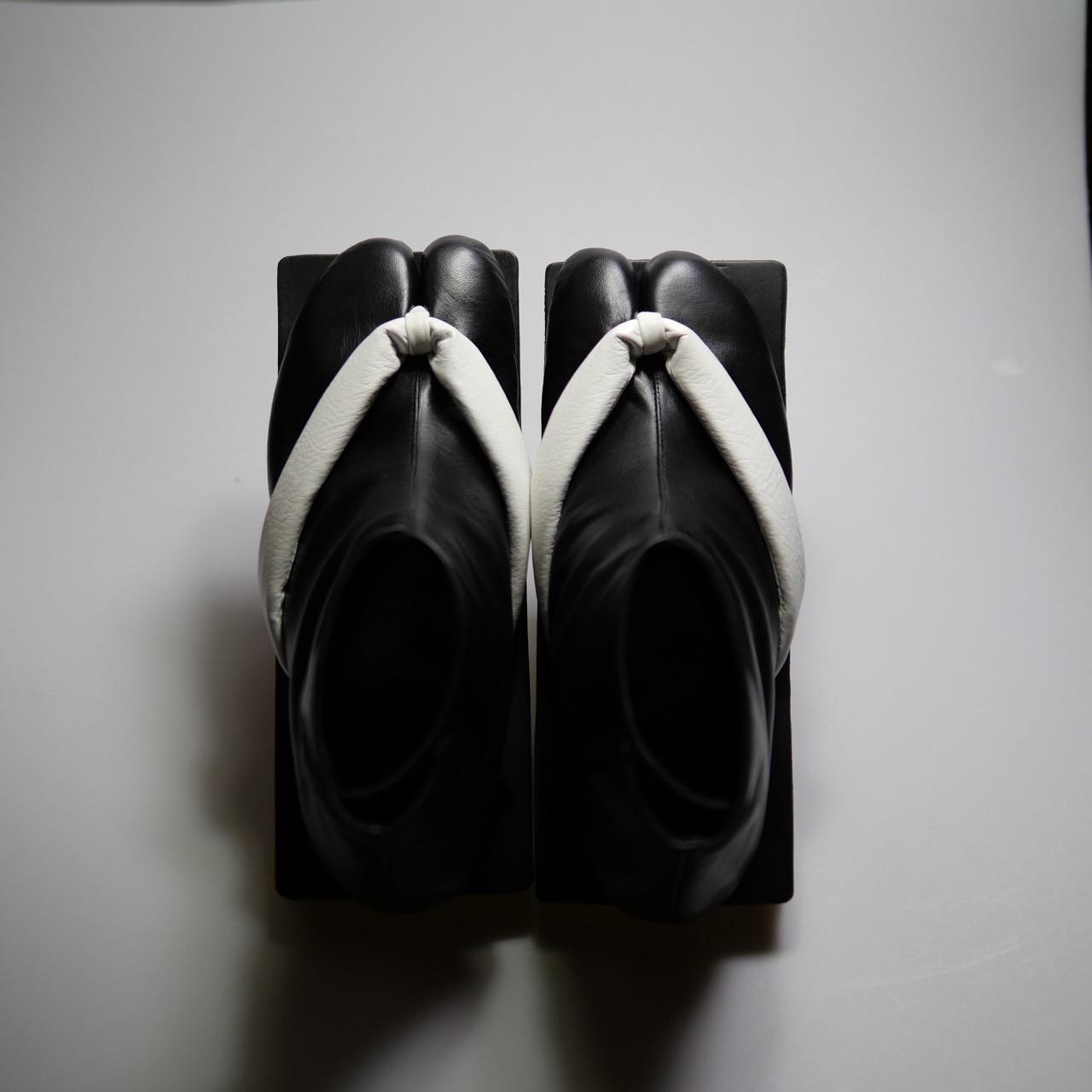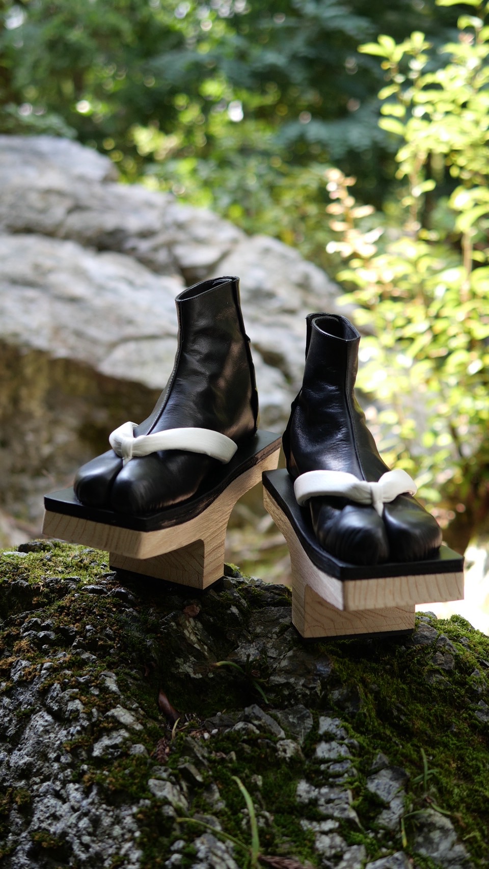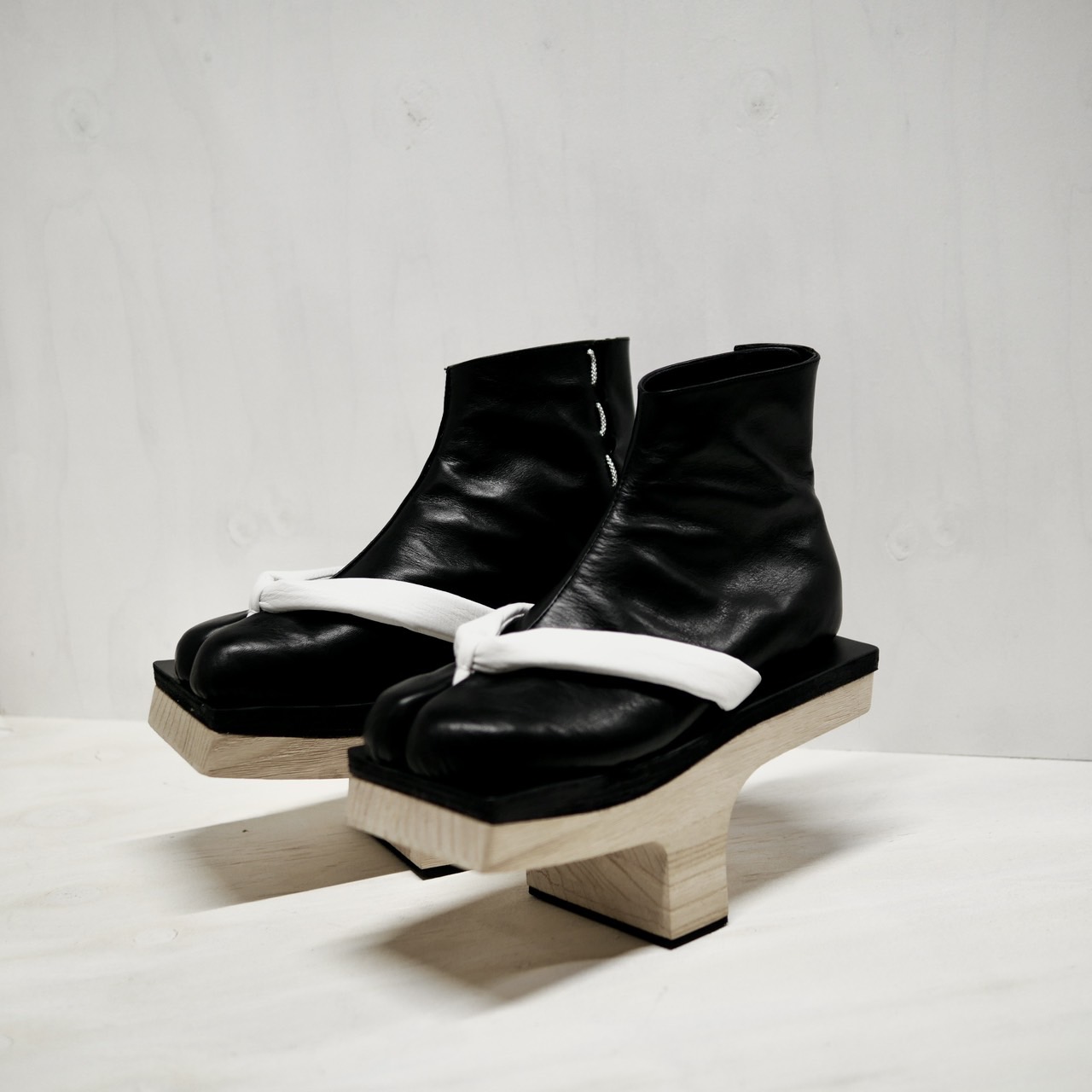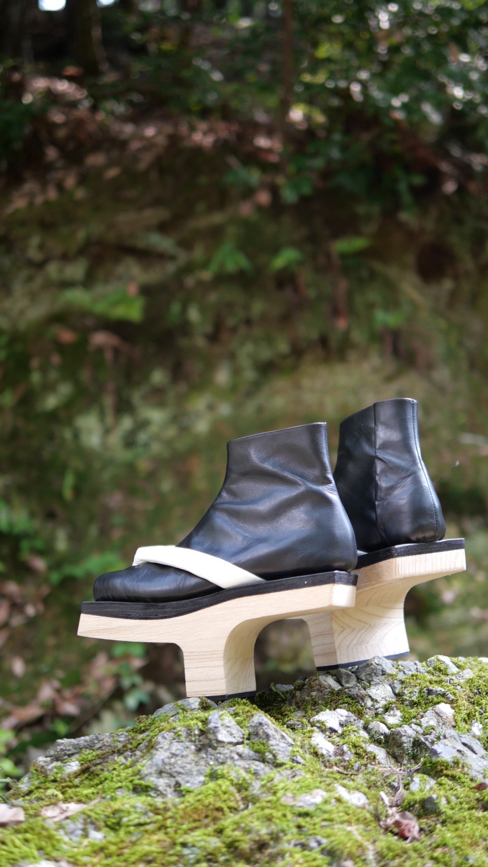 この作品は一本歯の下駄に、足袋を模した牛革製のアッパーを組み合わせ、さらにアッパーと同素材の鼻緒を装着した新しいデザインの靴です。