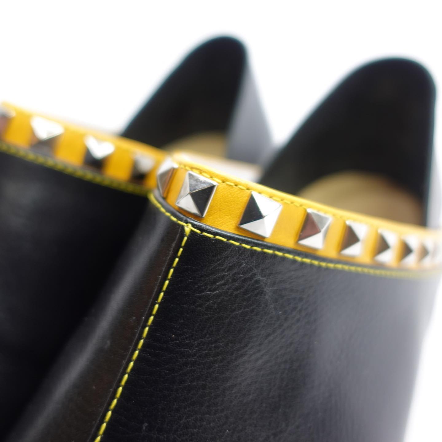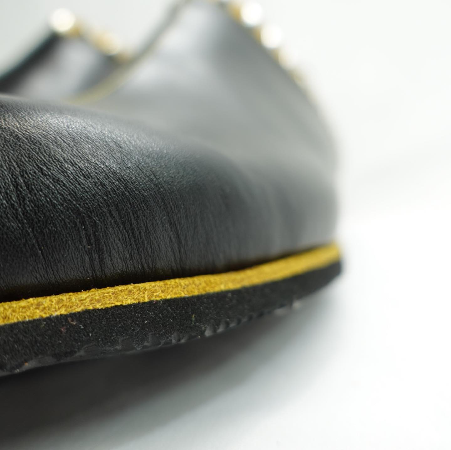 踵単皮スタッズ仕様特注履き口+ステッチ+ミッドソール山吹色